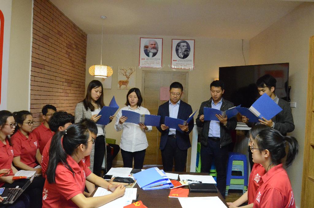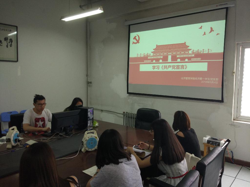 2018年5月9日下午18:00时工商二支部全体成员在周晨老师的带领下在未知研习社开展以诵读《共产党宣言》为主题的支部活动。 会议第一项由支部四名同志对《共产党宣言》原文进行诵读,其他同志聆听学习,会议第二项由支...