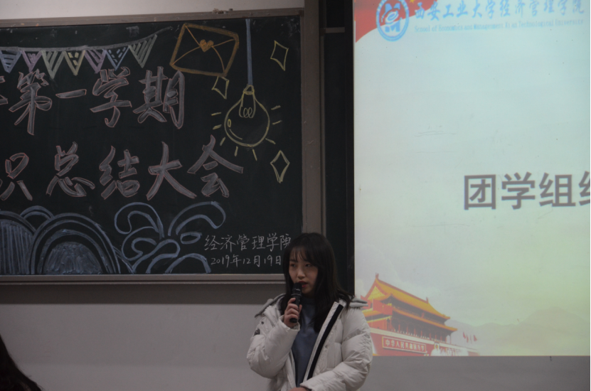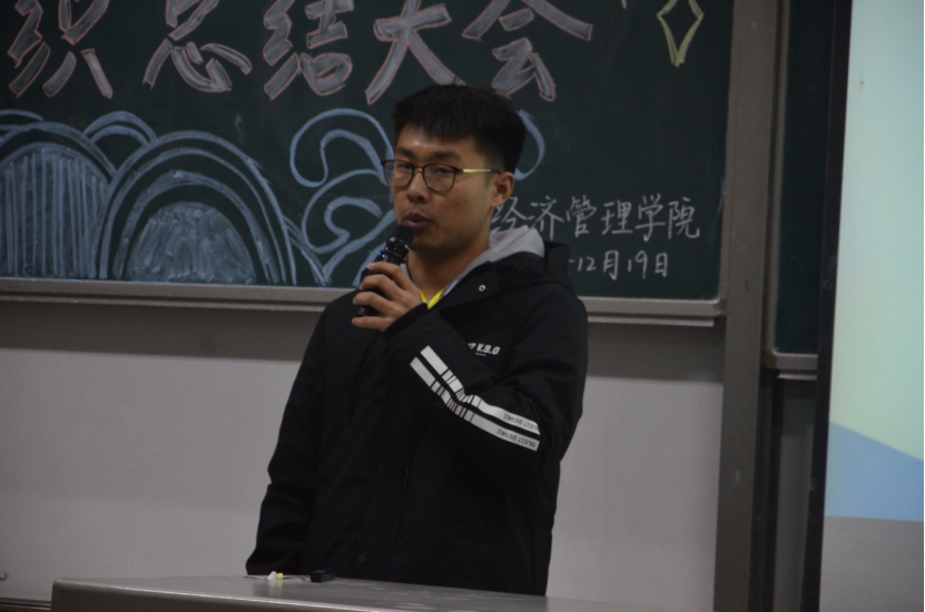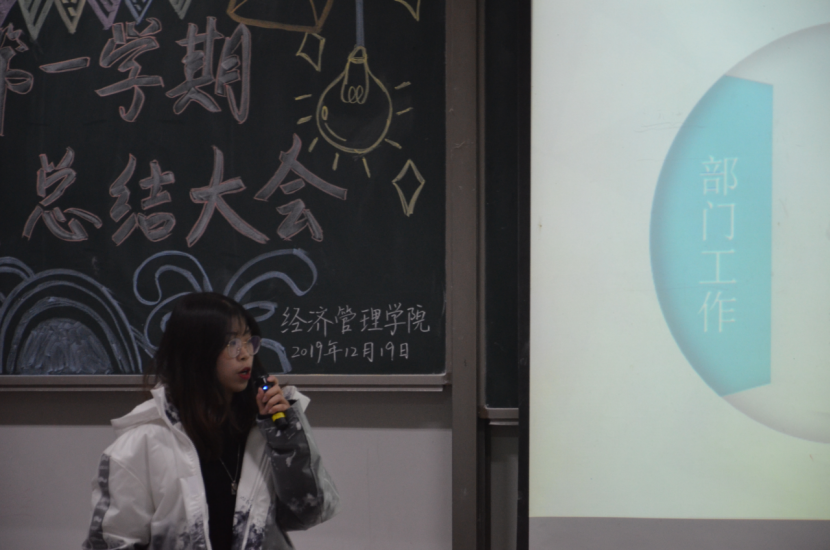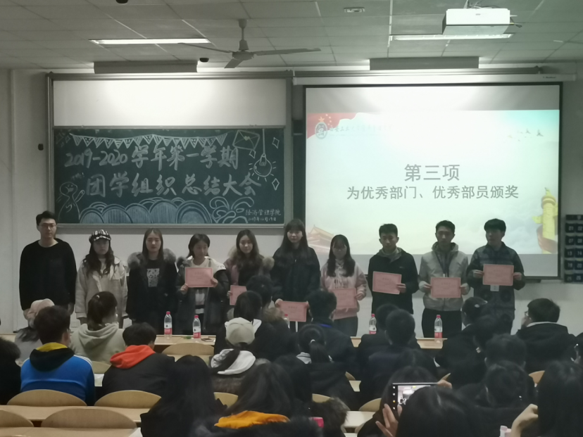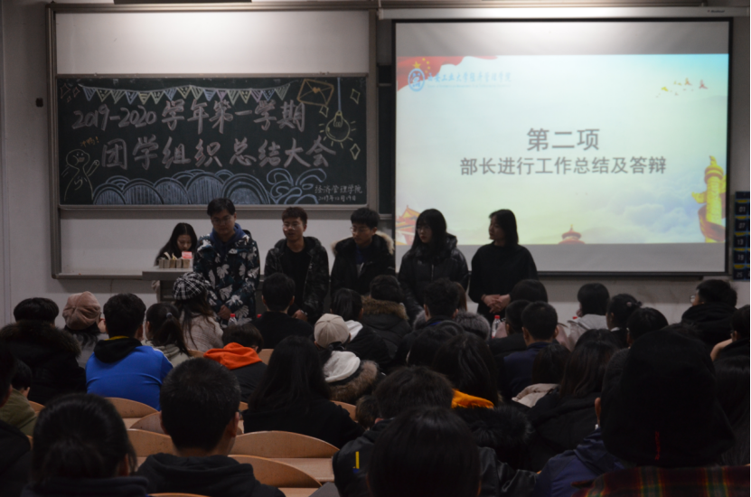 大会伊始,团学组织秘书长白宇洁作出讲话,她从活动开展与制度建设两个方面进行总结,肯定了过去一学期各项活动的贯彻实施及队伍建设的稳定发展。同时,她阐明员工干部应具有的“三心二意”之精神:责任心、自信心、包容心及满怀诚意,探寻工作意义。紧接着,团学组织各部门部长依次上台进行工作总结及答辩,回顾本学期的工作亮点,对存在的问题进行反思并提出改进方案,对下学期的工作进行规划,许金鑫老师也就具体问题进行了针对性的指导。随后,许金鑫老师及团学组织主席团为本学期优秀部门、优秀部员颁发荣誉证书并进行合影留念,优秀部员代表文艺部干事吴庆圆的精彩发言也使大会气氛达到高潮。最后,许金鑫老师肯定全体成员的工作成绩,结合具体实际提出看法,号召全体员工干部不忘初心,再接再厉,充分明确自身身份转换,希望大家总结经验与不足,克服现有的困难,更好地迎接下一学期的工作。