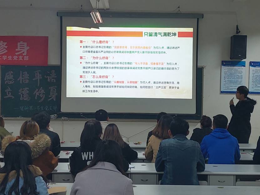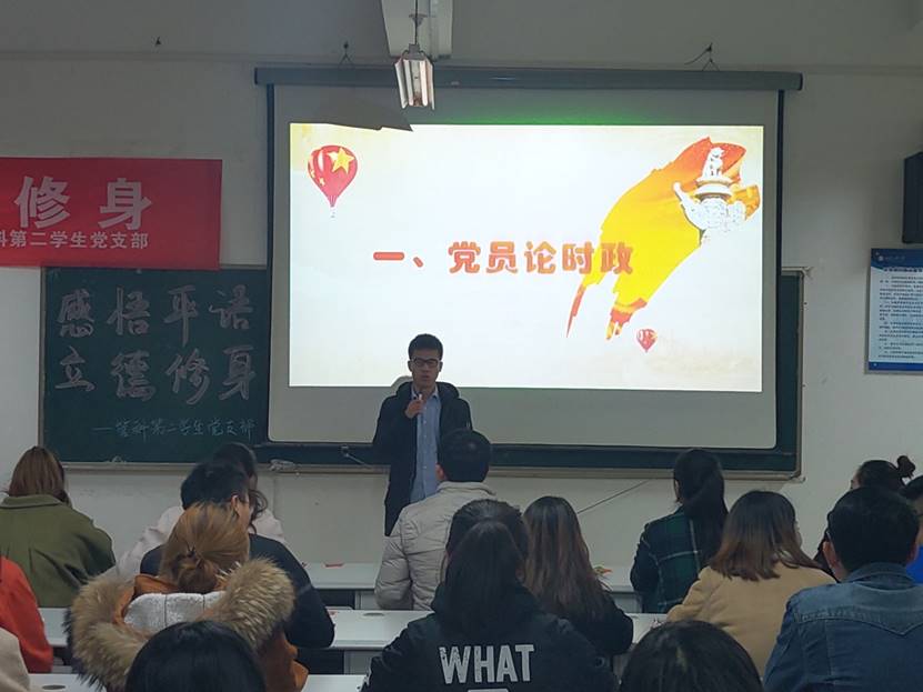 本次学习活动由17级研究生桑志强主持。活动分为党员论时政、“平”语入人心、问答忆传统、视频悟典故、学习交流传经典五个环节。首先,通过员工党员对时政热点的讲解与个人看法的阐述,使大家树立起学无止境的老员工学习观;紧接着,员工党员运用PPT为大家讲解经典用语及典故,中华传统文化直入人心,让同学们对在生活中运用典故有更深次的理解;随后,全体员工党员观看了《国之本在家》影片,学习习近平总书记对家风的有关思想,深切感受总书记所说“天下之本在国,国之本在家”的文化精髓;活动最后,老师和员工党员们互相分享交流,将中华文化与个人学习相联系,践行平“语”文化,传承经典的同时增强文化自信。