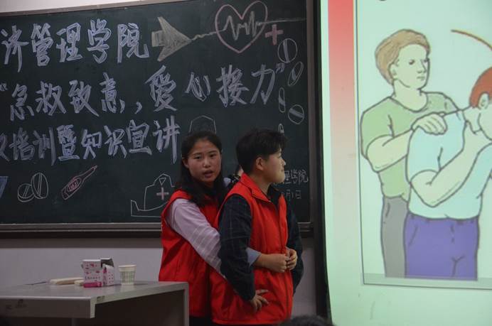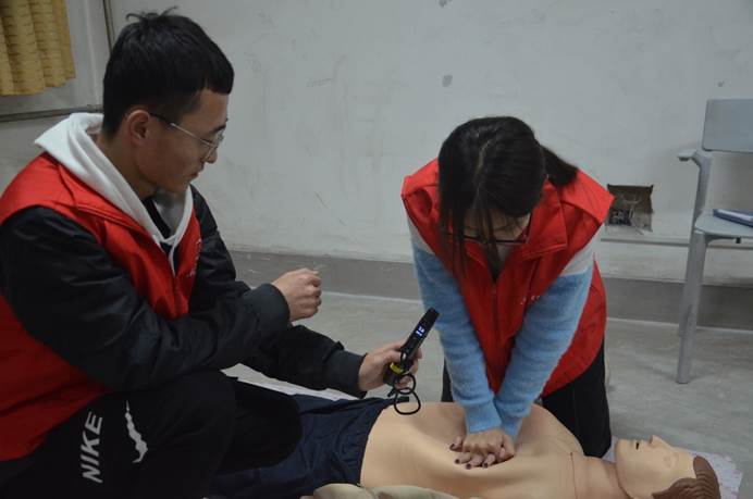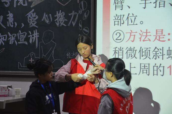 讲座伊始,由青协部长李素馨对来自西安医公司的同学进行了简单介绍,并表示热烈的欢迎。其次,由高乔乔同学向同学们介绍了八种常见病及其处理方法。讲解结束后,由服务队干事郭倩向同学们讲解包扎的相关知识,并展示创伤止血与现场包扎技术、现场骨折固定的模拟操作,同学们认真的看着包扎的演示,收益颇丰。最后,付榆涵等同学为大家介绍了心肺复苏的相关知识并模拟心肺复苏的操作,大家热情高涨,对急救知识表现出了极大的兴趣。