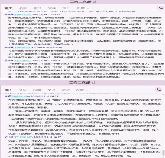 随后支部成员们展开热烈的讨论,苗静怡同志联想到马克思关于青年选择职业的文章感叹奋战在一线的“90后”党员选择为广大人民服务奉献的精神值得我们学习;李卓璟同志说总书记的回信不仅是对“90后”党员的赞扬,更是对我们的一种鞭策,激励我们为疫情防控做力所能及的事情;岳晗晴同志说我们应该时刻牢记总书记的嘱托,锤炼品德修为,练就过硬本领,肩负为社会为人民贡献新时代的青年力量。大家也纷纷表示作为一名“90后”员工党员,虽然在疫情来临时不能像一线的白衣战士们一样冲锋陷阵,但我们的心与前线奋斗的战士们紧密相连,我们要认真学习、深入贯彻总书记回信精神,积极响应党和国家号召,努力奋斗。