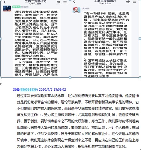 云参观后,支部全体党员在支部QQ群讨论交流了各自的心得体会,在这疫情非常时期获得了巨大的精神鼓舞!