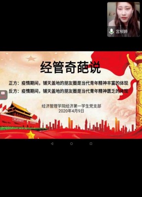 为丰富组织生活会内容,培养员工党员积极思考和团队配合能力、逻辑思考能力、语言表达能力及组织协调能力,经济第一员工党支部于2020年4月9日在线上直播平台开展了本学期第一次辩论赛活动。本次辩论赛以“疫情期间铺天盖地的朋友圈是否是当代青年精神丰富的体现”为主题展开讨论,力求让每一位员工党员能够在疫情期间反思身边朋友圈现象,并深刻领会当年青年的精神风貌。