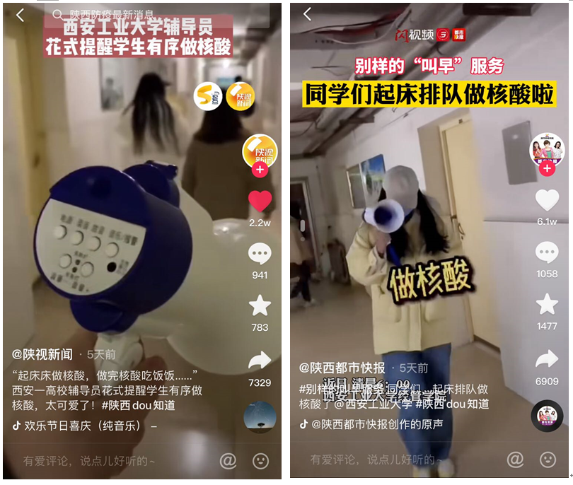 这些花式口号和歌曲都是ballbet贝博辅导员为引导员工积极排队做核酸而创作的,给平淡枯燥的封校生活增添些许活力。喊楼过程被拍成视频后受到陕西省教育厅、陕视新闻、西安都市快报、陕西政协20余家新闻媒体报道,在微信、抖音、微博、视频号等平台被广泛转载,视频累积转发播放量突破1000万次。