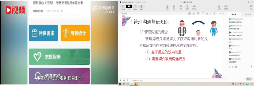 程成老师在《管理沟通》课程中,给员工展示了19名西北工业大学的员工共同开发的疫情防控小程序。小程序包括物资配送、用餐统计、志愿服务、信息汇总、心理咨询等板块,鼓励员工不断创新,运用专业知识为社会做贡献,培养员工的家国情怀与责任担当。