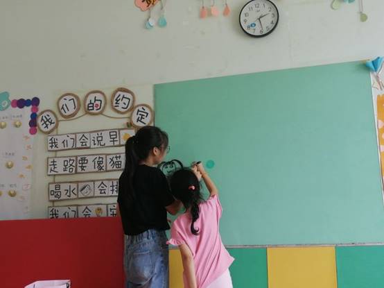 志愿者们主要是帮助老师,方便老师更好的进行教学,在早操时,帮助不会做动作的孩子跟上老师简单的动作,目的是为了让孩子拥有充满活力的一天。活动课和益智课交替进行,在活动课上,志愿者帮助老师管理孩子避免孩子们乱跑,同时也在老师的安排下参与了孩子们的活动课,跟孩子们玩球,过障碍等。在益智课上,老师教孩子们认识水果,动物,辨别冰水和热水,课间,志愿者吹泡泡逗孩子开心舒缓他们的心情。为了锻炼孩子的动手能力还安排了手工课,有涂色,贴瓜子等安全的课程。