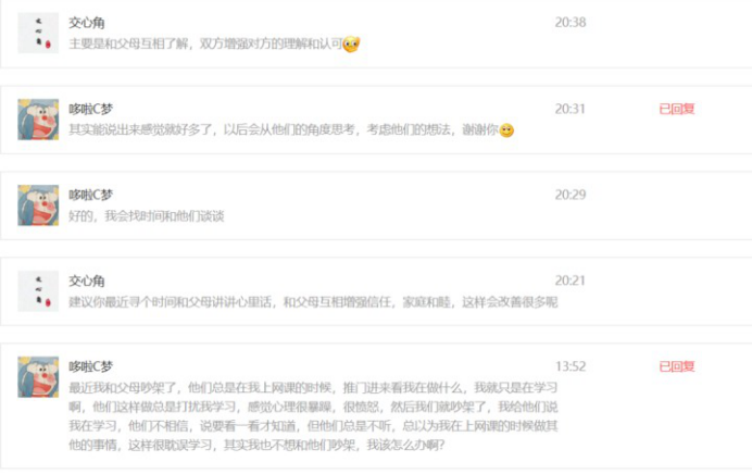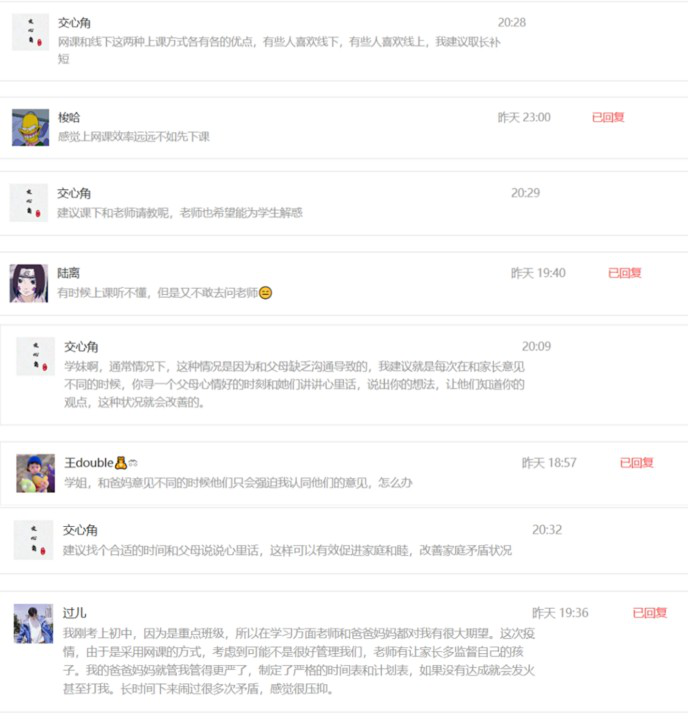在实践过程中,实践队公众号“交心角”不断地收到来自不同城市中小员工的留言,如“自身自制力不足总在上网课时分心、与家长产生矛盾不知如何解决”,倾诉方面众多,实践队也通过这些留言了解到中小员工网课期间的问题和真实感受。实践队根据了解到的有关心理辅导的相关知识,结合自己的亲身经历和以往积累的经验,对留言的中小员工进行心理辅导,帮助他们克服在网课期间学习生活方面的心理问题,改善和家长之间的矛盾。