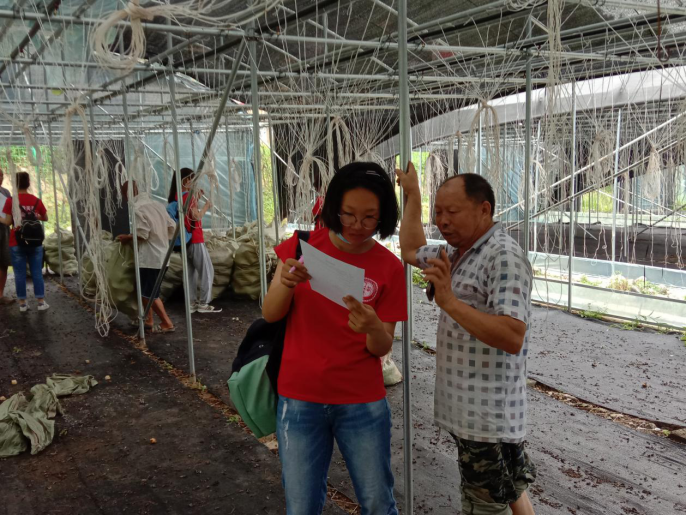 在当地村民的带领下,实践队来到凤凰村吊袋木耳种植基地进行实地学习。首先,实践队员们帮助当地村民进行木耳菌袋的收理工作。其次,对当地村民进行有关木耳种植收益及相关政策的问卷调查,通过调查问卷的统计结果,实践队员得出木耳种植占庭年收益的30%-50%,经处理的木耳会由当地收购商统一收购,不存在木耳滞销等结论。最后,有幸采访一位专门学习如何种植木耳的村民,细心地讲解了如何制作菌袋到吊挂菌袋、以及木耳种植的完整过程。当地村民因“木耳扶贫”政策,生活得到大大改善,使待业的村民可以在家门口实现就业。