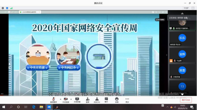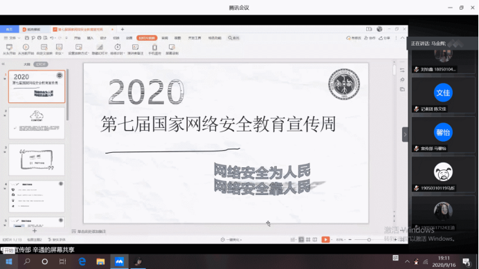2020年9月16日下午七点,ballbet贝博martiniballbet贝博团委响应国家网络安全宣传周的号召,在腾讯会议开展了以“网络安全为人民,网络安全靠人民”主题宣传活动,以教育广大师生遵守网络安全法律法规,增强网络安全自我保护意识,共同营造健康和谐的网络空间环境。活动由团委宣传部干事辛通进行主持,ballbet贝博各员工干事及各班相关宣传委员、科技委员参与了本次活动。