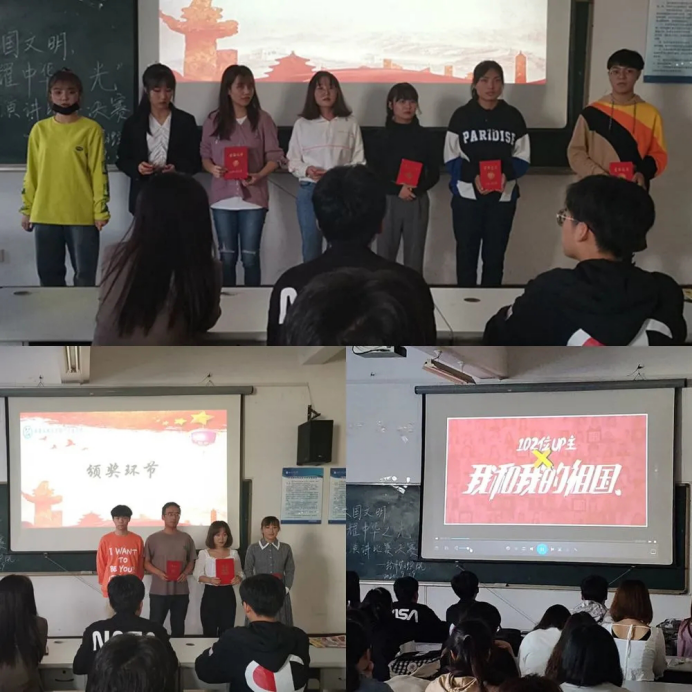 大赛前期,《祖国颂》等九份入围决赛作品由团学组织员工干部初评级选出。随后,入围的各位参赛选手齐聚一堂,在主持人向大家介绍了本次比赛的评委及相关赛制后,依次进行个人作品演讲。在比赛中,选手们紧扣主题,以饱满的热情表达着对大国文明的热爱与赞美,以昂扬的口吻述说着对中华之光的崇敬与自豪,赢得台下阵阵掌声。随着比赛进入尾声,在场的同学一同观看《我和我的祖国》短片,其浓厚的爱国气息与民族情怀深深烙印在每一位高举时代旗帜的新青年心中,激励着广大青年们不断创新,勇于奋斗。比赛结束,六号选手张娇艳对《我爱你,中国》的精彩演绎,获得了评委与观众的一致好评,赢得桂冠。最后,评委们为本次比赛获奖选手颁奖并进行合影留念,各参赛选手还在校园中于红旗下歌颂亲爱的祖国,献出自己的祝福,抒写优美的华章!