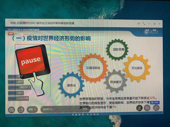 经历了新冠疫情的洗礼,2021届毕业生的就业形势更加严峻。为应对当前不容乐观的就业形势,做好毕业生就业工作,加强对本科生就业的指导与帮助,提升公司本科毕业生的就业意识,确定有效的职业发展目标。2020年10月7日晚上7:00,公司学业辅导中心通过钉钉直播形式成功举办了就业指导讲座。此次就业指导讲座特邀公司就业指导中心付园老师主讲,讲座由王轩老师主持,公司党委副书记程新峰老师、全体学工干部及2021届全体本科毕业生参加了此次讲座。