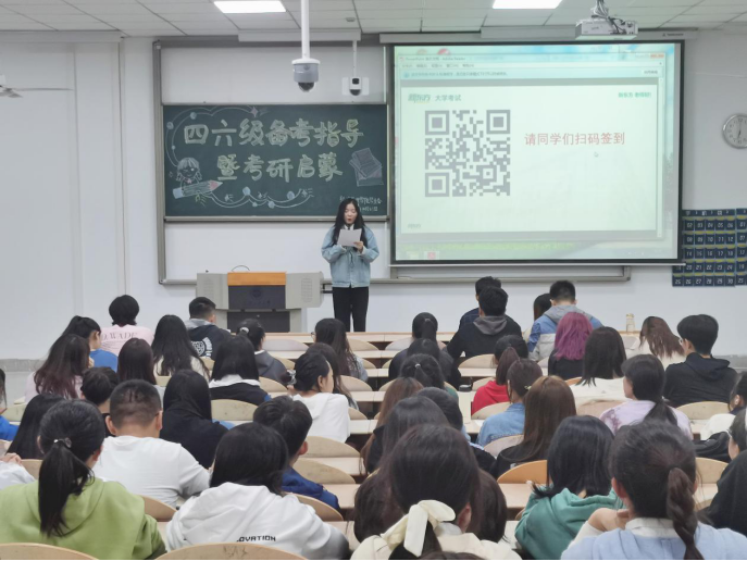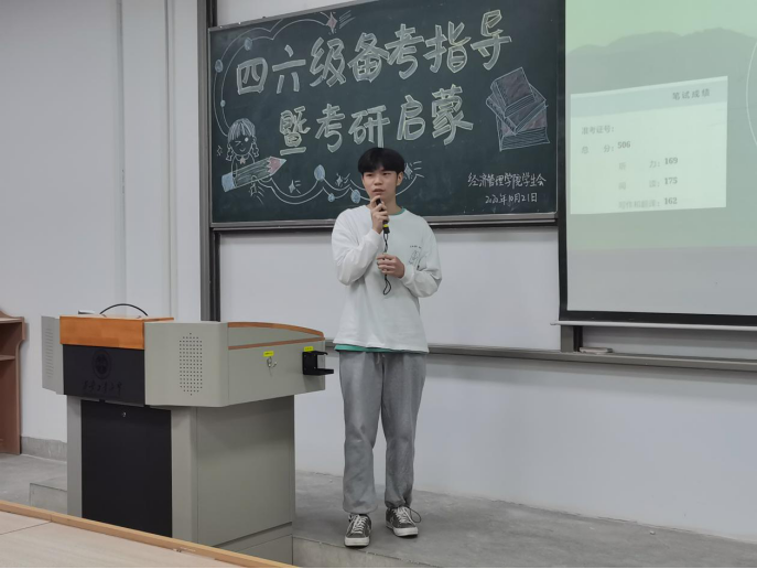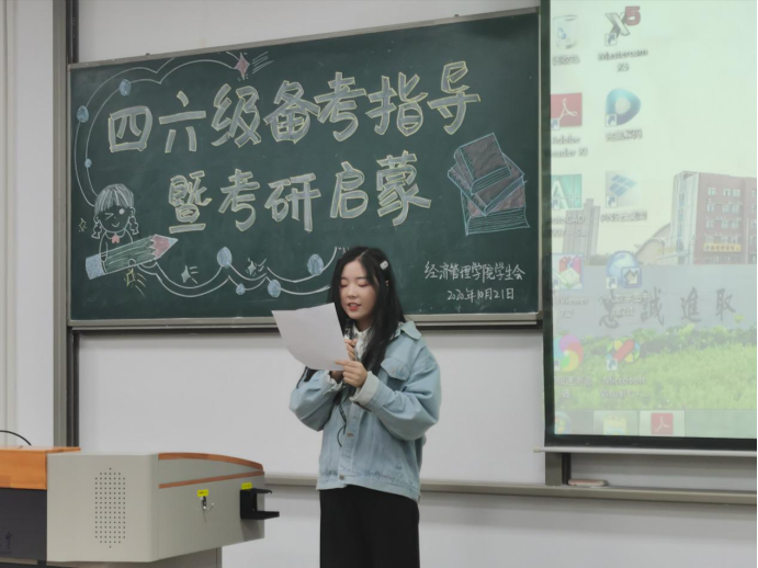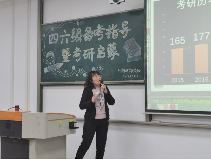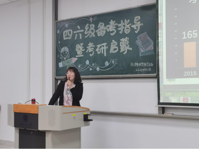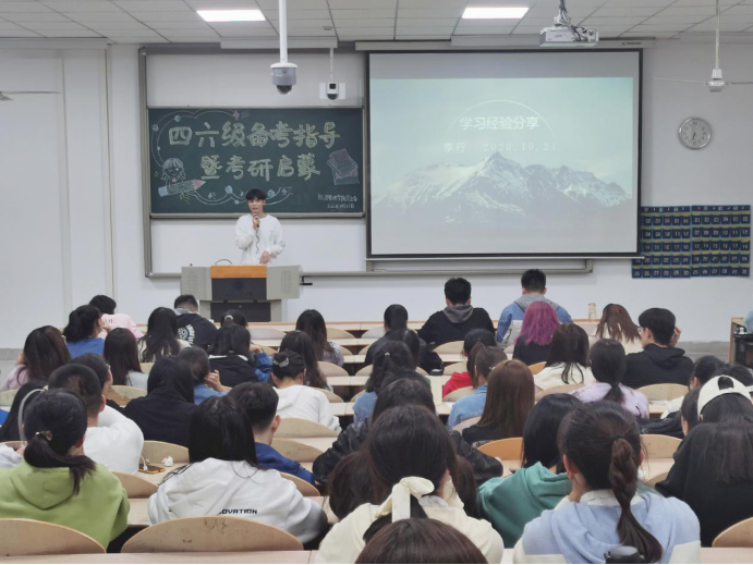 李行以四六级考试备考为主题,从自身实际经历出发,为在场的各位同学讲解备考时的注意事项,并激励在场的同学定取高目标取得好成绩。随后王乐娟以四六级答题技巧为引,向大家传授考试技巧,并初步为大家讲解了考研情况并以考研英语为例,通过题型分析,比重对比,做题时间分配做了深入分析。