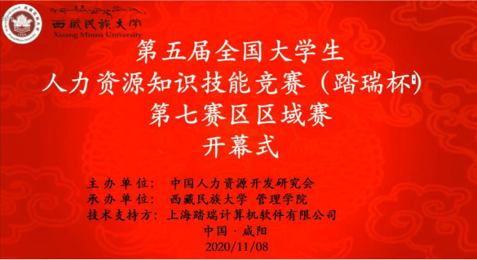 2020年11月8日,由中国人力资源发展研究会主办、西藏民族大学管理公司承办、上海踏瑞计算机软件有限公司技术支持的第五届全国老员工人力资源管理知识技能竞赛(踏瑞杯)第七赛区区域赛在线上顺利进行。公司人力资源管理专业参赛选手于人力资源管理实验室(教五505东)进行比赛,本次比赛由人力资源管理专业系主任李育英老师带队,武朝、班军营、王源和翟晨雨四名同学组成参赛代表队。