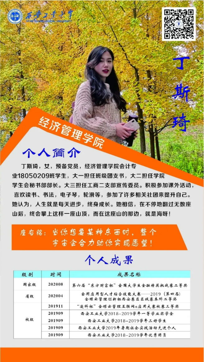 丁斯琦,女,预备党员,ballbet贝博会计专业18050209班团支书,曾获第六届“东方财富杯”全国老员工金融精英挑战赛二等奖,在校期间共获省级奖项1项、校级奖项5项。