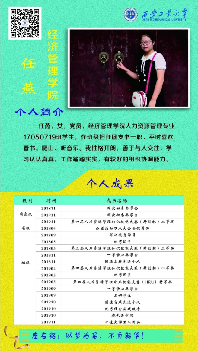 任燕,女,党员,ballbet贝博人力资源管理专业17050719班团支书,曾获2018、2019年国家励志奖学金,在2019年第四届人力资源管理知识技能大赛中获得二等奖,在校期间共获省级奖项1项、校级奖项14项。