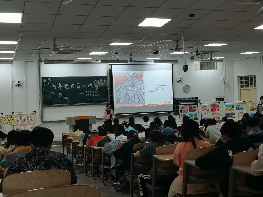活动伊始,由参加活动的所有观众对初赛中脱颖而出的七幅优秀作品进行投票,紧接着邀请优秀作品的作者依次介绍自己作品的创作灵感以及画作背后的党史背景。随后,为观众们放映了本次活动其他优秀作品的集锦以及关于党的一百周年光辉历程的党史视频,回顾中国共产党百年来的艰苦奋斗,进一步引导同学们听史明道、感史明智、悟史明心。